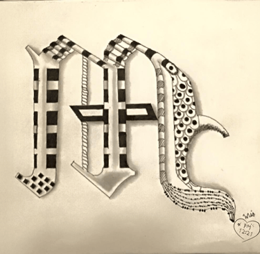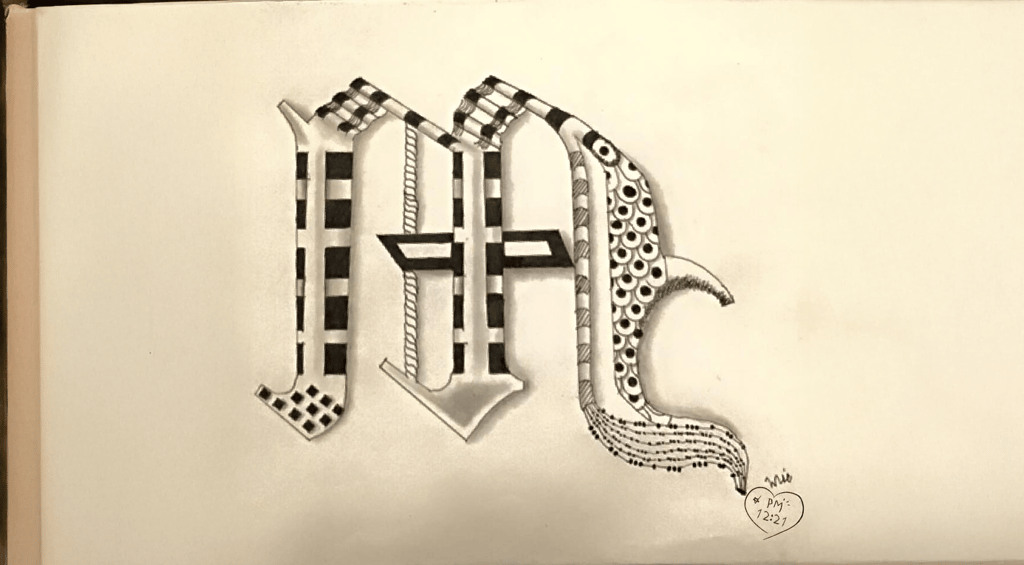 呢幅圖入面嘅 M,唔係普通嘅 M。入面有格仔、有線條、有圓、有暗紋,好似一個人身上嘅經歷、傷痕、記憶。佢唔係一筆過畫出嚟,而係一層層堆疊出嚟——就好似人生。
